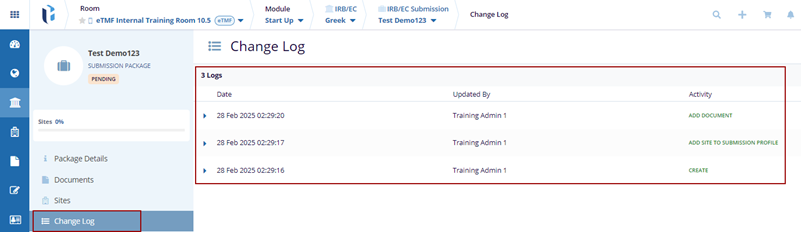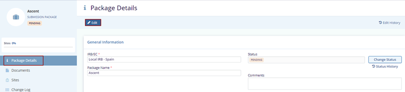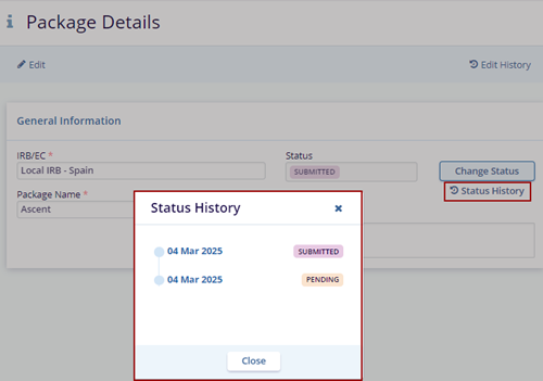 A Status History button is displayed below the Change Status button. Click the button to view the name of the user who made the changes on the IRB/EC Details page.
