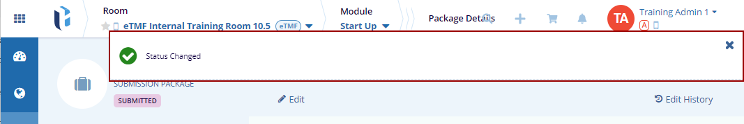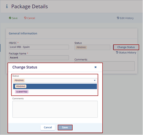 - Click the Change Status button displayed on the Package Details page. This opens the Change Status pop-up window.