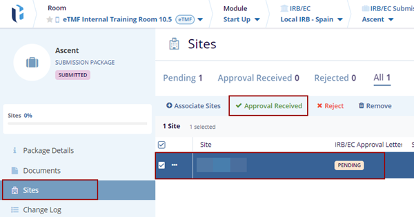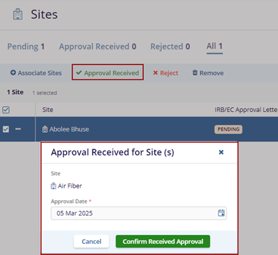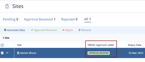 - Click the Confirm Received Approval button to confirm the approval. The IRB/EC Approval Letter column displays the Approval Received status for the selected site.
