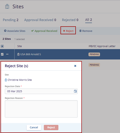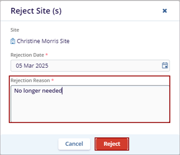 - Locate the Site and click the Reject button on the top menu bar. The Reject