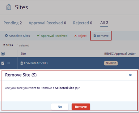 - Locate the site and click the Remove button on the top menu bar. The Remove