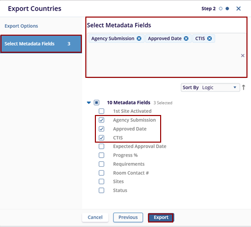 4. Click Export to export the data, Previous to return to the previous page, or Cancel to discard the changes.