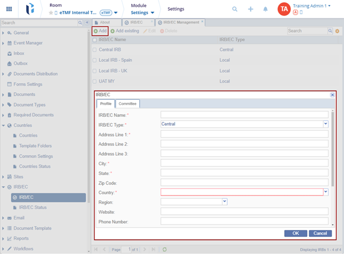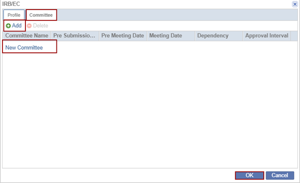 - Click the Add button. The IRB/EC window is displayed with the Profile tab by