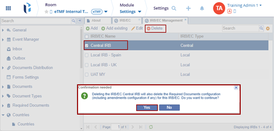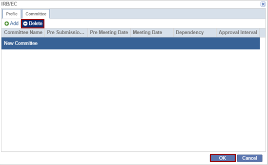- Locate the IRB/EC Name and click the Delete