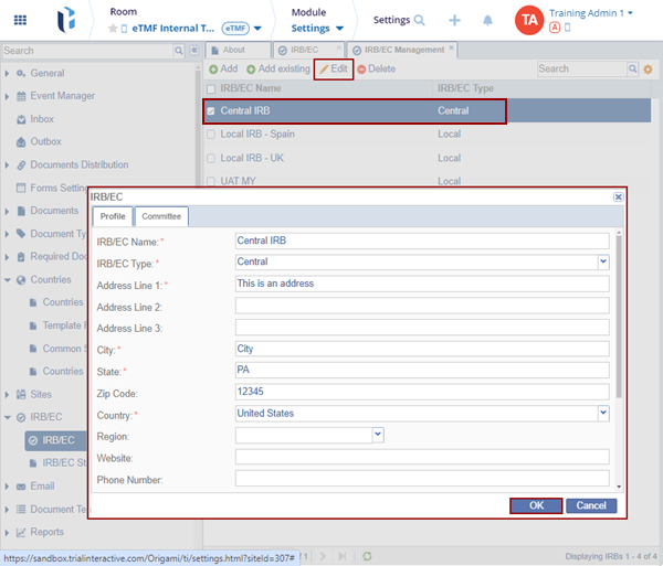 - Locate the IRB/EC Name and click the Edit button.