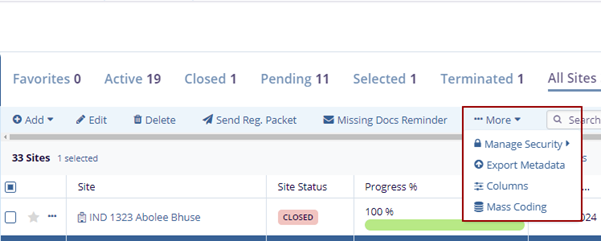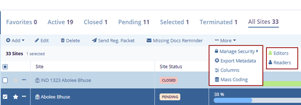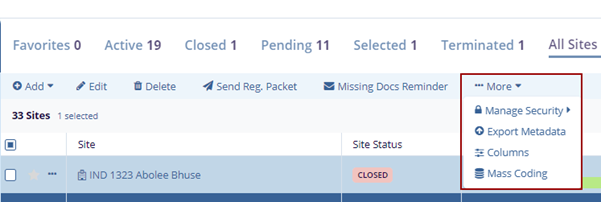 - Select a site by clicking on the checkbox, clicking the