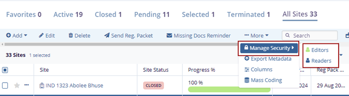 - Select a site by clicking on the checkbox and click the