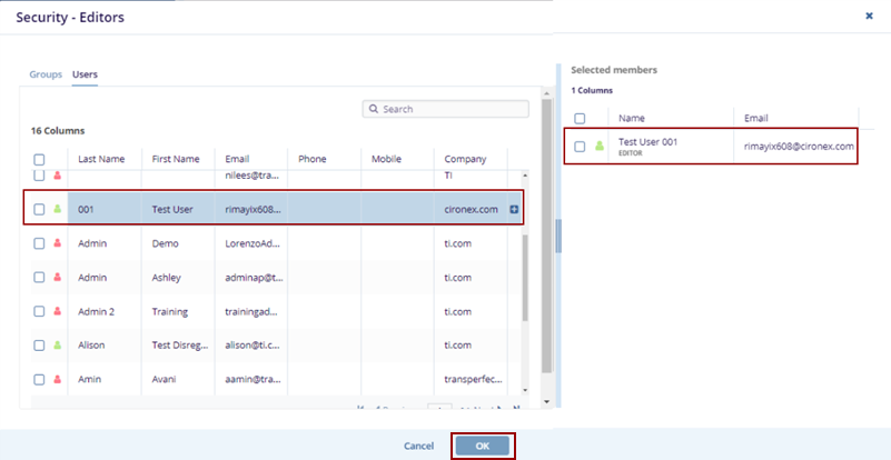 - The Security – Editors screen is displayed with the Groups and Users tab, hover the mouse over the names to highlight in blue and view the Plus icon next to each username.