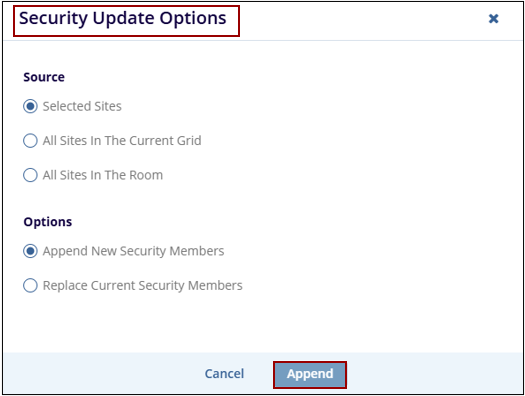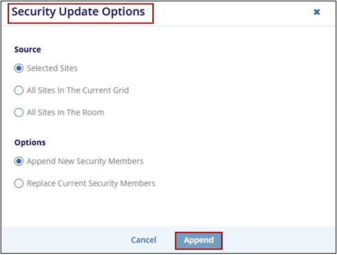 - A Security Update Options popup window is displayed with Cancel and Append buttons.
