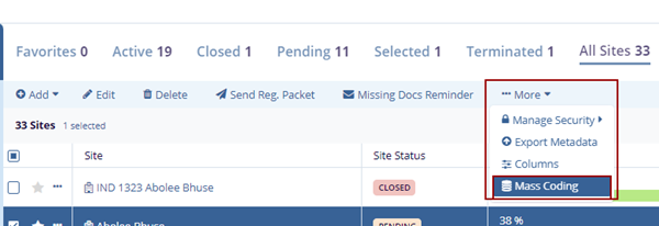 1. Select a site by clicking on the checkbox and click the More dropdown button and select Mass Coding.