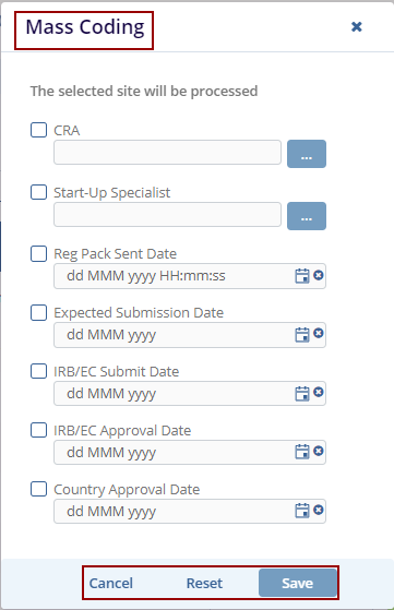 2. The Mass Coding pop-up window is displayed with the Cancel, Reset, and Save buttons.
