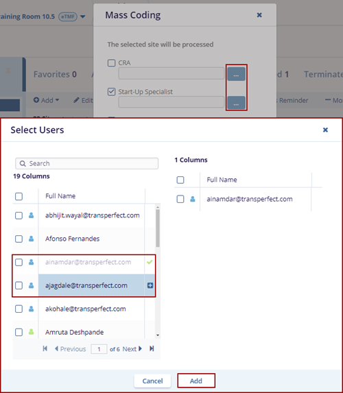 3. Select the three-dot menu for the CRA and Start-Up Specialist fields. This opens the Select Users window.