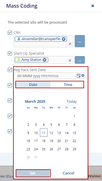 4. If required, select the checkbox(s) for the below date fields and click the Calendar icon next to those fields, select an appropriate Date and Time, and click on the Set button on the Calendar view.