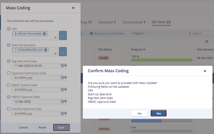 7. The Confirmation Mass Coding pop-up window is displayed with No and Yes buttons.