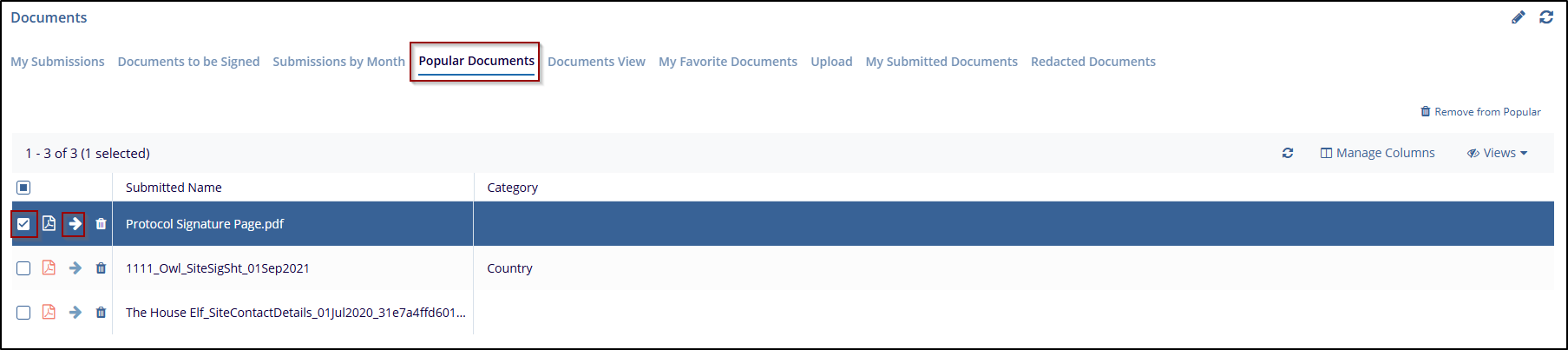 In the Documents Dashboard, select Popular Documents from the menu at the top. This view lists documents that are frequently accessed or marked as popular, along with details such as the Submitted Name and Category or Country. This is similar to My Submissions.