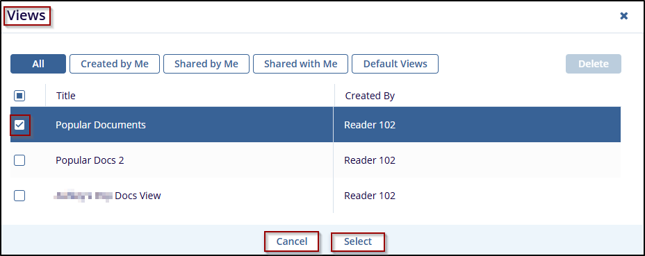 - After selecting a view, the user can delete it by clicking the Delete button.