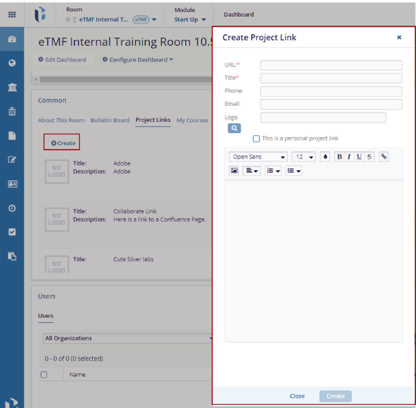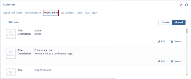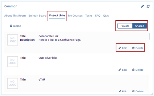 The Project Links tab displays links to various websites and resources used in the study, allowing team members quick access to important external content. Users with Editor-level permissions and above can create new links by clicking the Create button. Each link can be set as Private (visible only to the user) or Shared (visible to all users). This setup allows users to organize and manage external resources effectively.