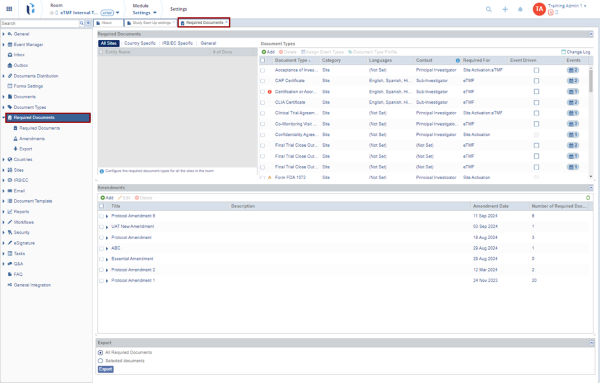 The Required Documents Settings allow Administrators to define and manage the required documents for a study. Some document types may be mandatory for all investigative sites, while others may be required only for sites in specific countries. These settings are typically configured at the start of a study, but can be adjusted if needed during the study.