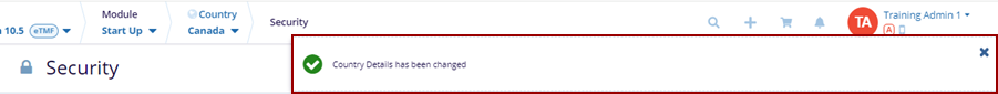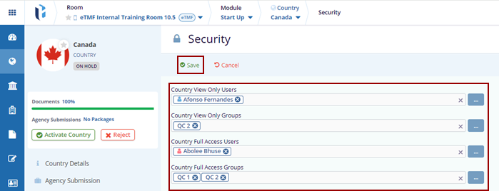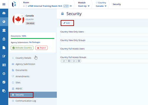 - Click on the Security tab of the Country module. This opens the Security page in the center of the screen.