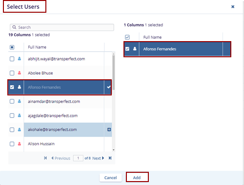 - Select the checkbox(s) of the users whom you want to add to view only the country. Click the Plus sign next to the name. OR Drag and drop the name to the right-side pane. The selected names are reflected in the right-side pane. Also, the selected names in the left pane are greyed out.