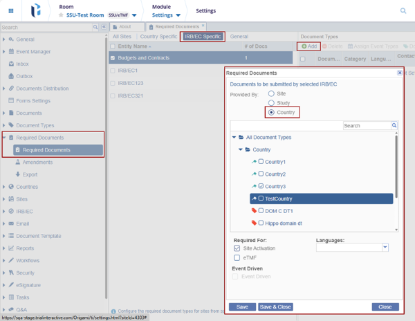 1. In the Settings module, select the IRB/EC specific from the list within the Required Documents section.