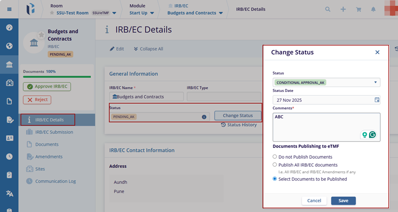 7. The IRB/EC details page is displayed with the General Information section.