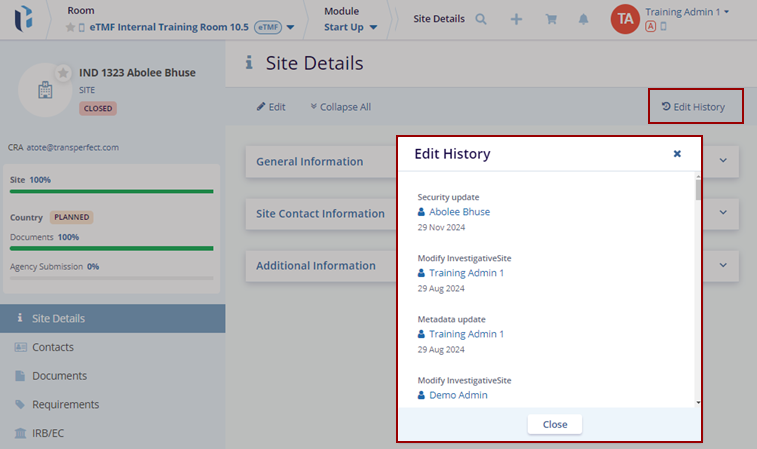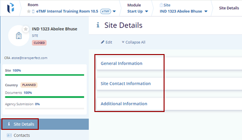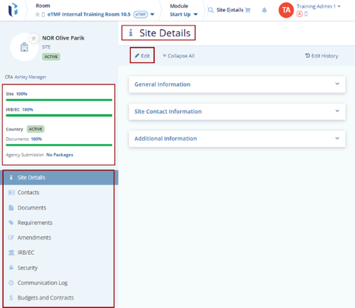 The Site Details page displays a progress bar for the Site, Country, and IRB/EC, along with an activation notice based on the percentages shown.
