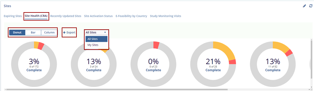 The Site Health (CRA) tab provides a summary of the completion status for multiple sites, allowing users to monitor site progress effectively. This tab displays three chart types—Donut, Bar, and Column—that display the percentage of tasks completed out of the total for each site. Users can also export the data for external reporting or analysis. Additionally, the All-Sites dropdown menu allows for filtering, enabling users to narrow down the view to specific sites or groups as needed.