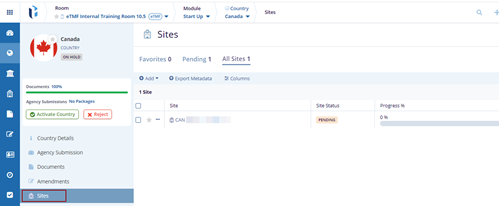 The Sites tab in the Country module displays all sites associated with the selected country. From this page, users can: