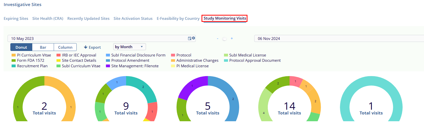 The Study Monitoring Visits tab provides a breakdown of the monitoring visits conducted over specific periods. Users can view visit data by month and year, with each circular chart displaying the total number of visits for that time and color-coded segments representing various document types (e.g., PI Curriculum Vitae, Protocol Amendment, Administrative Changes). The tab offers flexibility to change the chart type between Donut, Bar, and Column views, and an Export button to download the data. The date range can be adjusted using the date fields to focus on specific periods, helping users track and analyze visit trends over time.