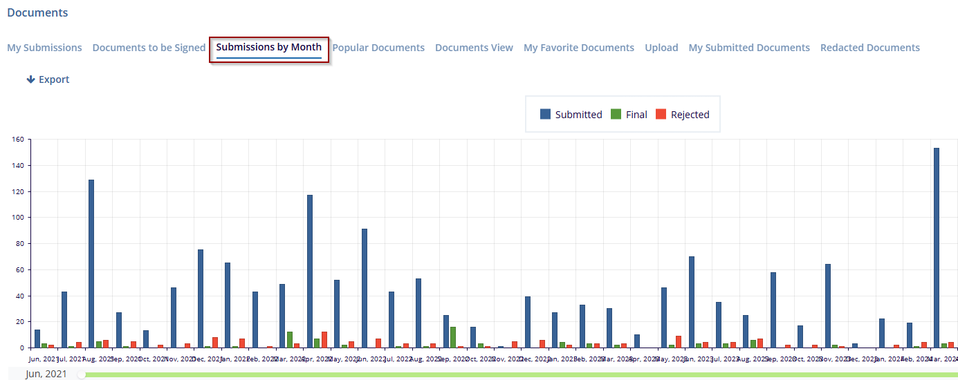 In the Documents section, select Submissions by Month from the menu at the top. This view displays a bar chart representing the number of document submissions per month, categorized by submission status.