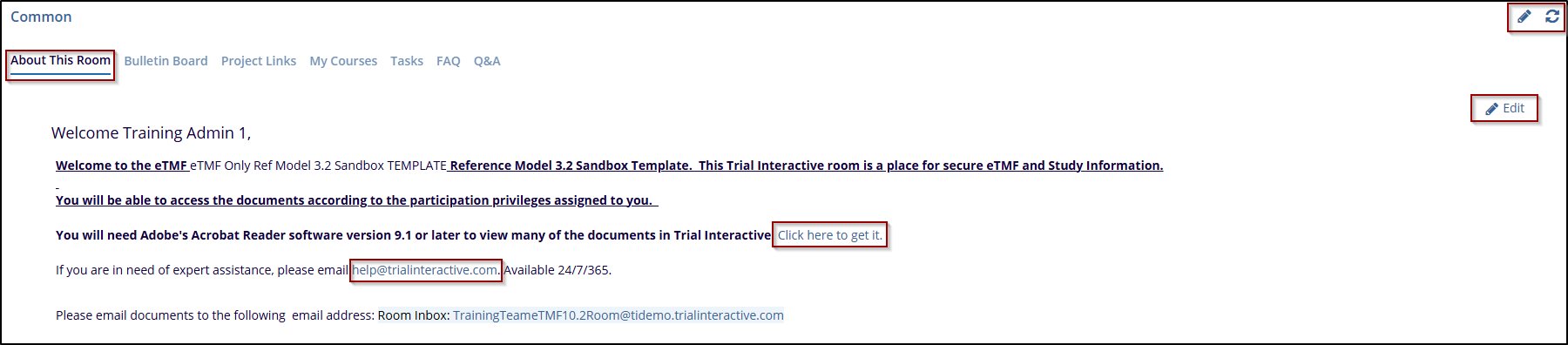 The About This Room tab provides a welcome message and important information regarding the use of the room. This space can be customized to include study details, access requirements, and relevant support information. It mentions the need for Adobe Acrobat Reader for viewing certain documents and includes a link to download it. Users with Administrator or Manager roles can edit this content to ensure that all participants have up-to-date information and resources.