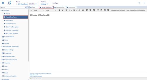 The About This Room section displays the Welcome message containing information about the specific room. You can include placeholders such as ##UserName## and ##SourceRoomName## to dynamically display the user’s name and room name. Ensure you click Save to apply and retain any changes.