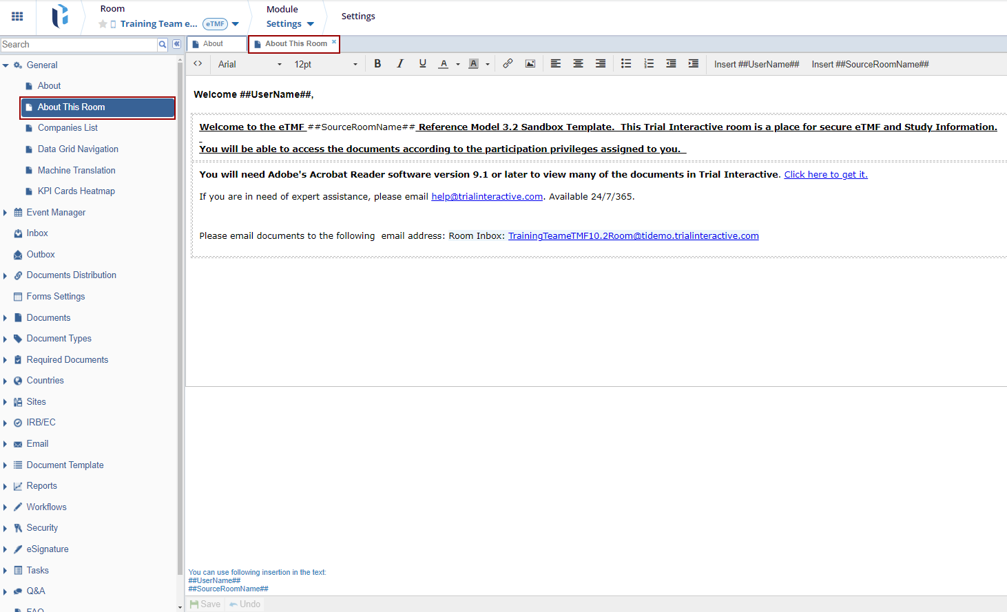 The About This Room section displays the Welcome message containing information about the specific room. The user can include placeholders such as ##UserName## and ##SourceRoomName## to dynamically display the user’s name and room name. Ensure you click Save to apply and retain any changes.