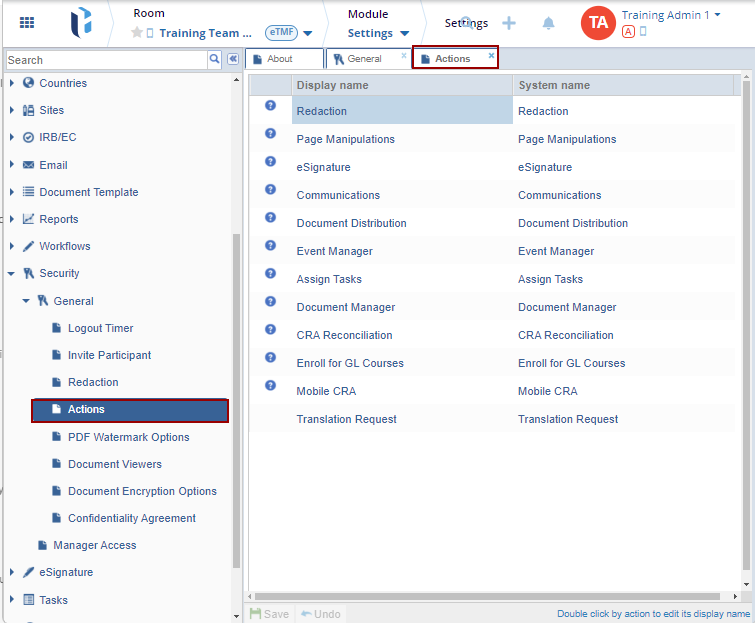 The Action pane displays the tasks enabled for users within a specific room. Each task name has a unique tooltip, which varies based on the 'Display Name' and 'System Name'. To check the description, hover the mouse on the tooltip icon beside the Display name. Refer to the screenshot below: