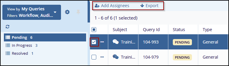 - Navigate to the left panel, and select status as per user requirements (Pending, in Progress, Resolved). This will display queries in a grid view.