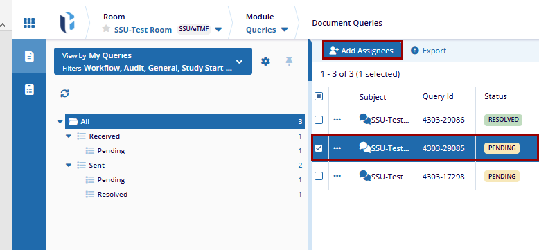 - Navigate to the left panel, and select status as per user requirements (Pending, in Progress, Resolved). This will display queries in a grid view.