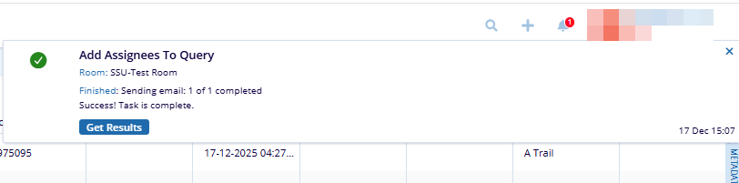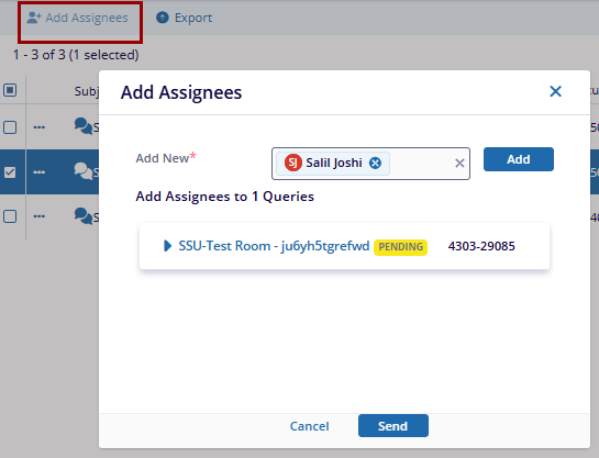 - Once selected, click the "Send" button to assign the user to the query. This will confirm the assignment or click ‘Cancel’ to discard changes.