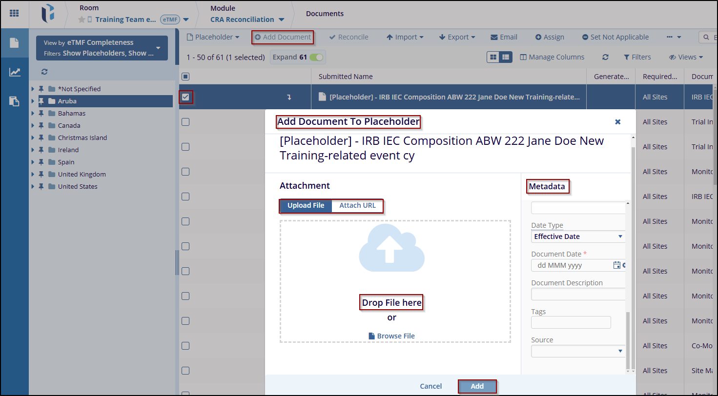 The Add Document refers to uploading a document or attaching a URL, such as an eTMF (Electronic Trial Master File) document. These documents may include queries, audits, or any other files that need to be added to the placeholder.