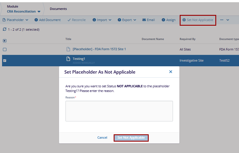 - Enter the specific reason to set the status not applicable for selected placeholder.