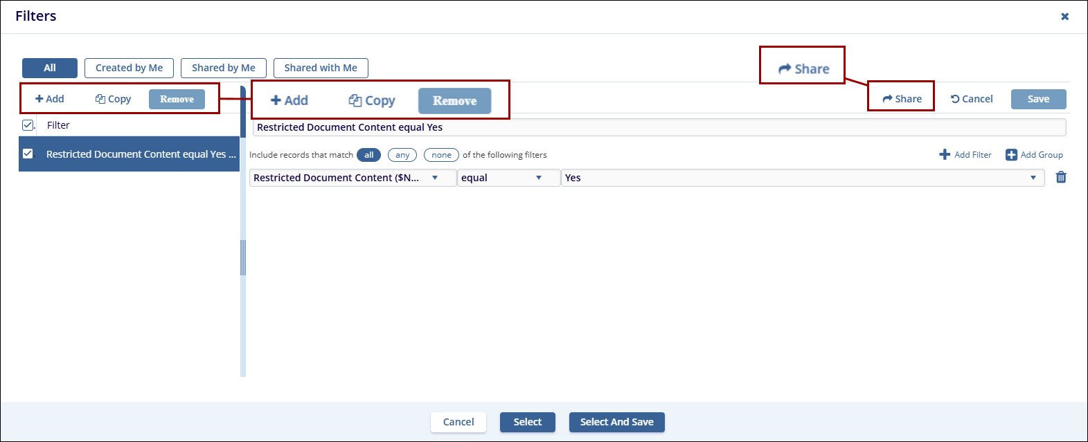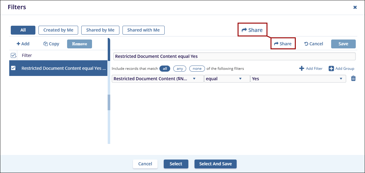 - On the Filters screen, select the filter, and it appears in the right pane with +Add, Copy, Remove and Share options enabled.