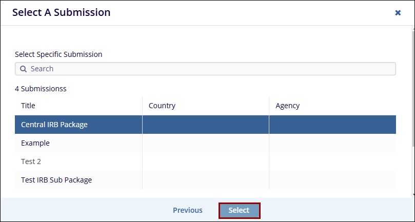 - On the Select a Submission window, choose a submission package and click on the Select button.