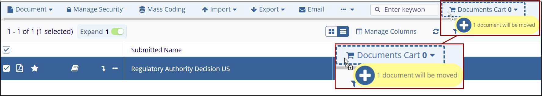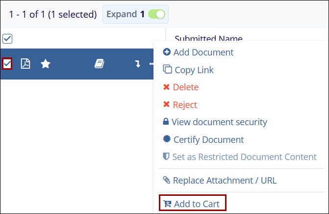 Locate the document that is to be added to the Document Cart and select the checkbox next to it.