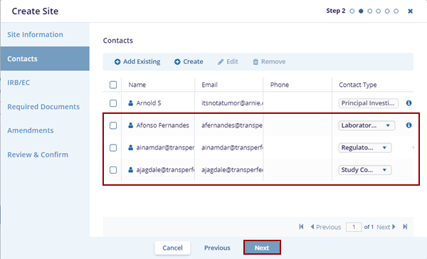 - The Contact’s tab is displayed on the Create Site pop-up window.