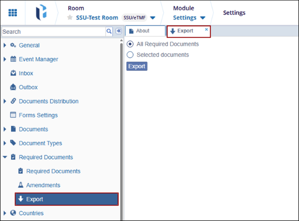 In this menu, Administrator users can export either All Required Documents or Selected documents. Refer to the screenshot below: