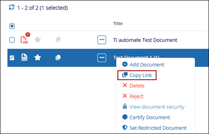 If referencing a specific document to another room user for review, the Document ID Number can be provided or the Document Activities menu can be opened to select Copy Link, which will copy a direct URL link to the clipboard. Anyone using the link must have sufficient access to the study room in order to view the document.