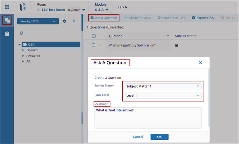 Ask a question can be done from three dots menu next to checkbox in Document module or directly from the Q&A module. Questions that are related to a specific document should be created.