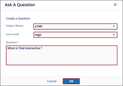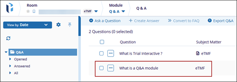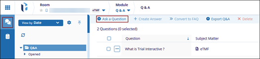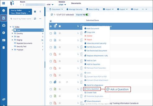 Users can create questions either by navigating to the Documents tab within the eTMF module to create a document-specific question, or by accessing the Q&A module to create a general question.