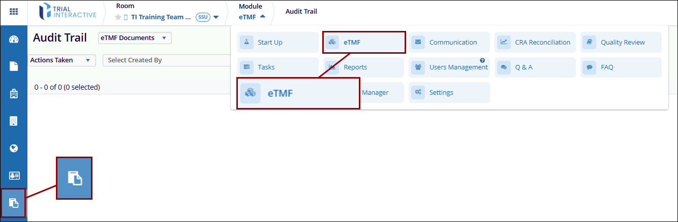 To access the Audit Trail modal within the eTMF module, follow the steps below.