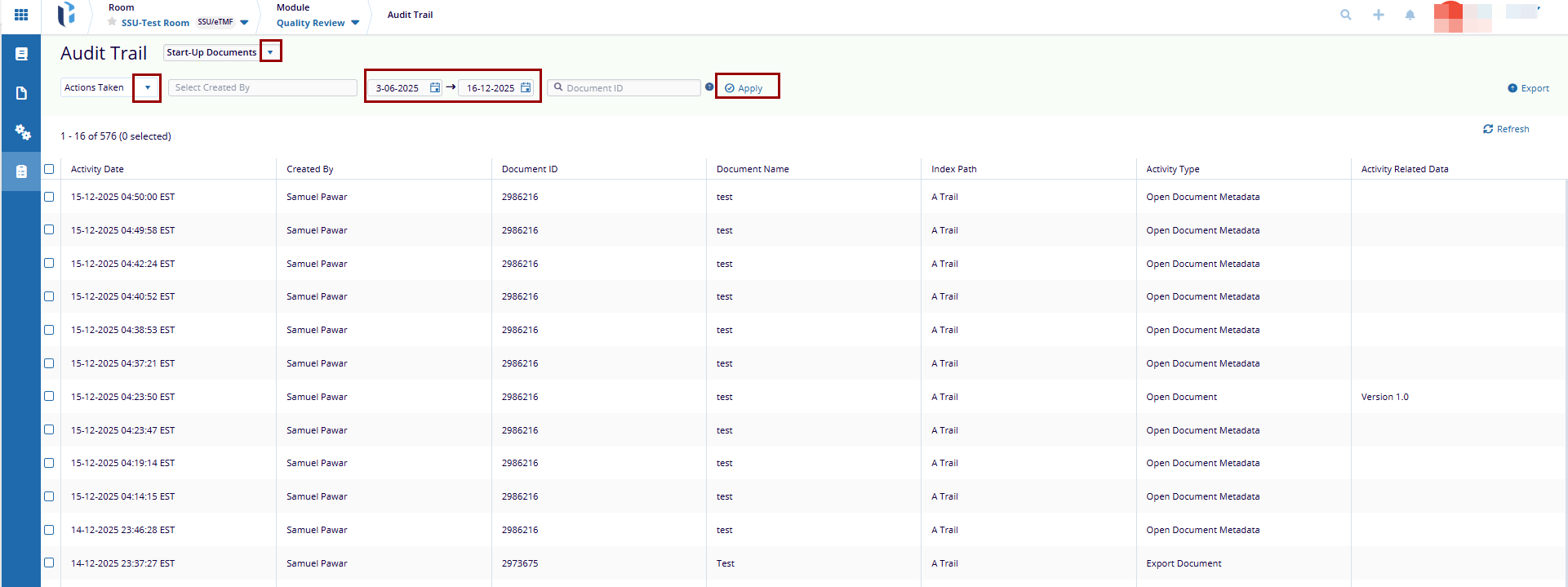 The Audit Trail in the Quality Review module provides a comprehensive record of all actions performed on documents within a study room. This is designed to help users track activities for auditing and compliance purposes. Users can filter the audit trail by various criteria to efficiently retrieve specific records.